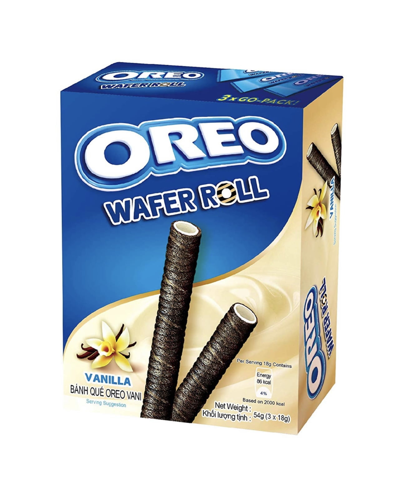 The classic Oreo has undergone a transformation, and can now be enjoyed as a crispy chocolate wafer roll with a vanilla creme filling! 54g box contains 3 x 18g twin packs.